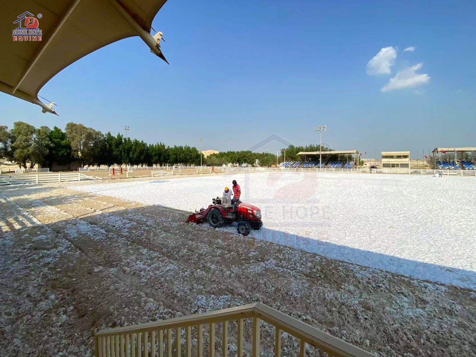 Footing fiber in ShineHope Equine is classified into Fluffy geotextile fibers (GTA), Geotextile small flakes (GTB), and Blended footing (GTB Mixture). Fluffy geotextile fibers enhance arena footing performance and riding experience. GTB is incorporated into the mixture to improve stability, drainage, cushioning, and dust control. Blended footing offers optimal support for various horse activities. Our Footing Fiber, a specially formulated material added to horse arena riding surfaces in diverse blends and ratios for customization, brings multiple benefits. It binds with base materials like sand for surface stability and consistency, suitable for all equestrian activities. It provides impact absorption and joint protection, crucial in preventing injuries during high-intensity actions. The textured surface it forms enhances traction and grip, beneficial for quick maneuvers and reducing slip risks. It also controls dust and air quality, maintaining a healthy and clean arena environment. Ideal for all types of horse arenas, from professional competition venues to private training facilities, and can be combined with different base materials to achieve desired riding surface characteristics. Our collection combines it with Arena Levelers to create a perfect riding surface environment, carefully designed to meet the needs of both horses and riders, ensuring a safe, comfortable, and high-performance arena.