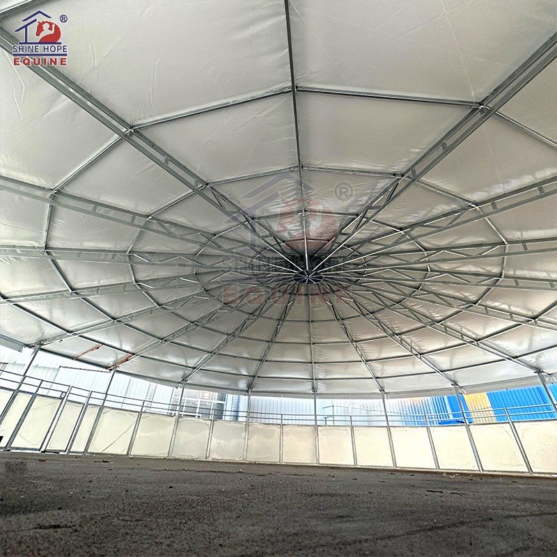 Shinehope round pen cover is a structure designed to enclose and protect a round pen, often used for horse training, exercise, or containment. It is essentially a roof or canopy built over a circular fenced area to provide shelter from all weather conditions.Below is a description of round pen covers and their features and benefits:
