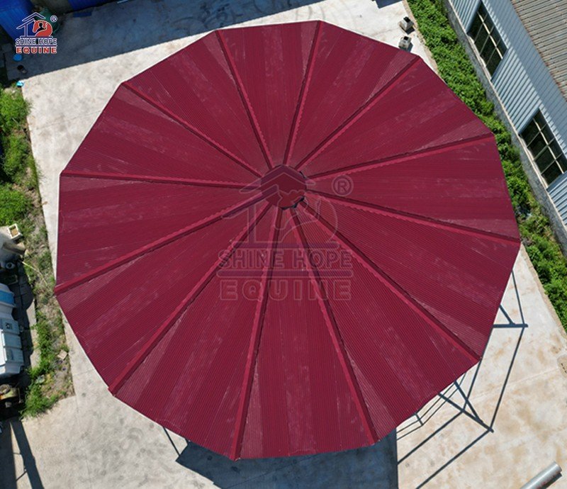 The fabric round pen covers ( vinyl coated polyester ) and Metal round pen covers ( metal roofing ) from ShineHope Equine are more popular and durable for long-lasting use.